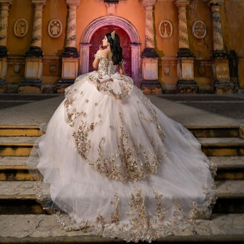 The Enchanted Gold Princess gown looks like it stepped straight out of a fairy tale. Its soft light-beige tone paired with shimmering gold embroidery creates a warm, regal glow worthy of a true storybook princess. The skirt is extra voluminous, crafted with layers of tulle that add movement, presence, and a dreamy silhouette. Every embroidered detail enhances the gown’s elegance, turning each step into a scene worthy of a Disney moment. This is the perfect dress for the quinceañera who wants to live her night as the star of her own magical story. Estimated production time: 30–45 days.