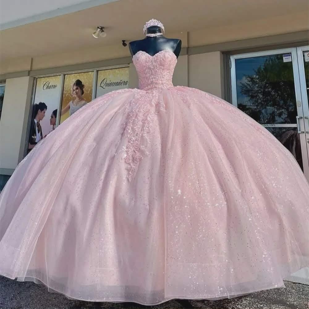 Step into a world of soft elegance with Rosé Royalty, a pastel–pink quinceañera gown designed to steal hearts. The beautifully shaped corset highlights the figure with romantic charm, while the ultra–voluminous skirt creates that dreamy, floating princess silhouette. Delicate embroidered details and a soft shimmering glow complete the look, making it perfect for the girl who wants to shine with sweetness, elegance, and undeniable presence.